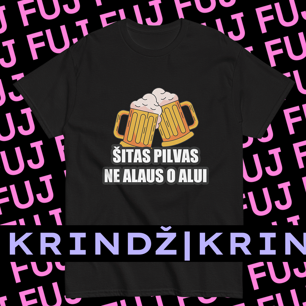 Vertimas: PIRK MŪSŲ MARŠKINĖLIUS, KAD DRAUGAI KLAUSTŲ IŠ KUR GAVAI, BET NEKLAUSTŲ AR PATS PASIDAREI. NEŠIOK IR PARODYK PASAULIUI, JOG GAL IR ESI BIŠKI NUŠOKĘS NUO PROTO, BET UŽTAT LAISVAS KAIP PALANGOS BENAMIAI. DOVANOK TIK TIEMS, KURIE NENAUDOS JO TIK MIEGUI IR LINKĖS KIEKVIENAM PRAEIVIUI SKANIOS KAVELĖS IR GEROS DIENELĖS.
